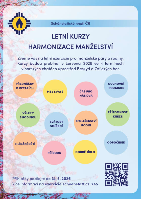 Schönstattské hnutí ČR srdečně zve na letní exercicie pro manželské páry a rodiny. Kurzy budou probíhat v červenci 2026 ve 4 termínech v Beskydech a Orických horách.