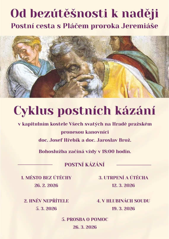 Srdečně zveme na cyklus postních kázání Od bezútěšnosti k naději aneb Postní cesta s Pláčem proroka Jeremiáše. V kapitulním kostele Všech svatých na Hradě pražském budou kázat kanovníci doc. Josef Hřebík a doc. Jaroslav Brož. Bohoslužba začíná vždy v 18.00.