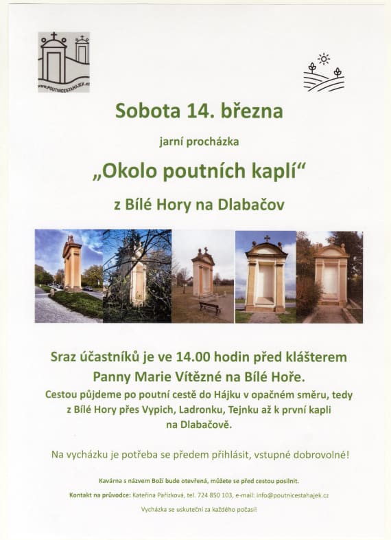 Srdečně zveme na jarní procházku „Okolo poutních kaplí“ z Bílé Hory na Dlabačov, která se uskuteční v sobotu 14. března. Sraz účastníků je ve 14.00 před klášterem Panny Marie Vítězné na Bílé Hoře. Procházka povede z Bílé Hory přes Vypich, Ladronku až k první kapli na Dlabačově. Na vycházku je třeba se předem přihlásit.
